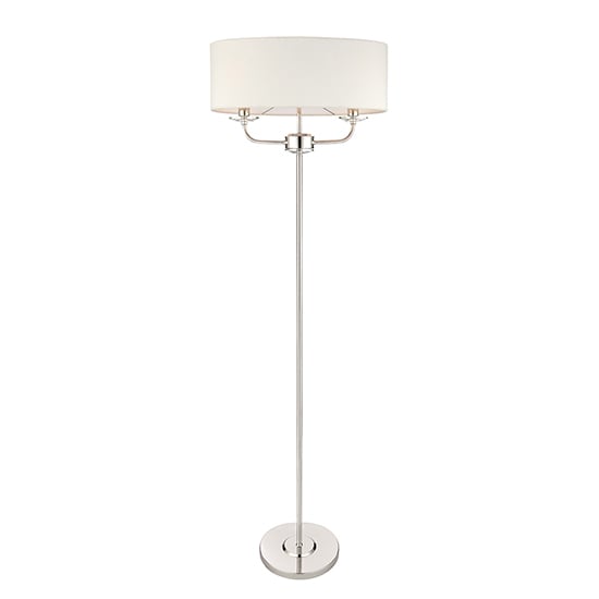 A 2 light floor light finished in a bright nickel plate with a vintage white silk shade and crystal glass detailing. suitable for use with LED lamps and supplied with an inline foot switch. FEATURES : Material : Steel, Glass, Fabric Finish : Bright Nickel, Clear, Vintage White 2 x 40W E14 candle (bulb not included) Modern classic style floor lamp Bright nickel plate & vintage white fabric High quality K9 crystals beaches In-line on/off foot switch 2 meters black flex Perfect for use with E14 LED lamps Constructed from steel & fabric & crystal glass Available at an affordable price Images shown are for illustration purpose only DIMENSIONS : Height : 1570mm Shade Height : 150mm Shade Diameter : 260-520mm